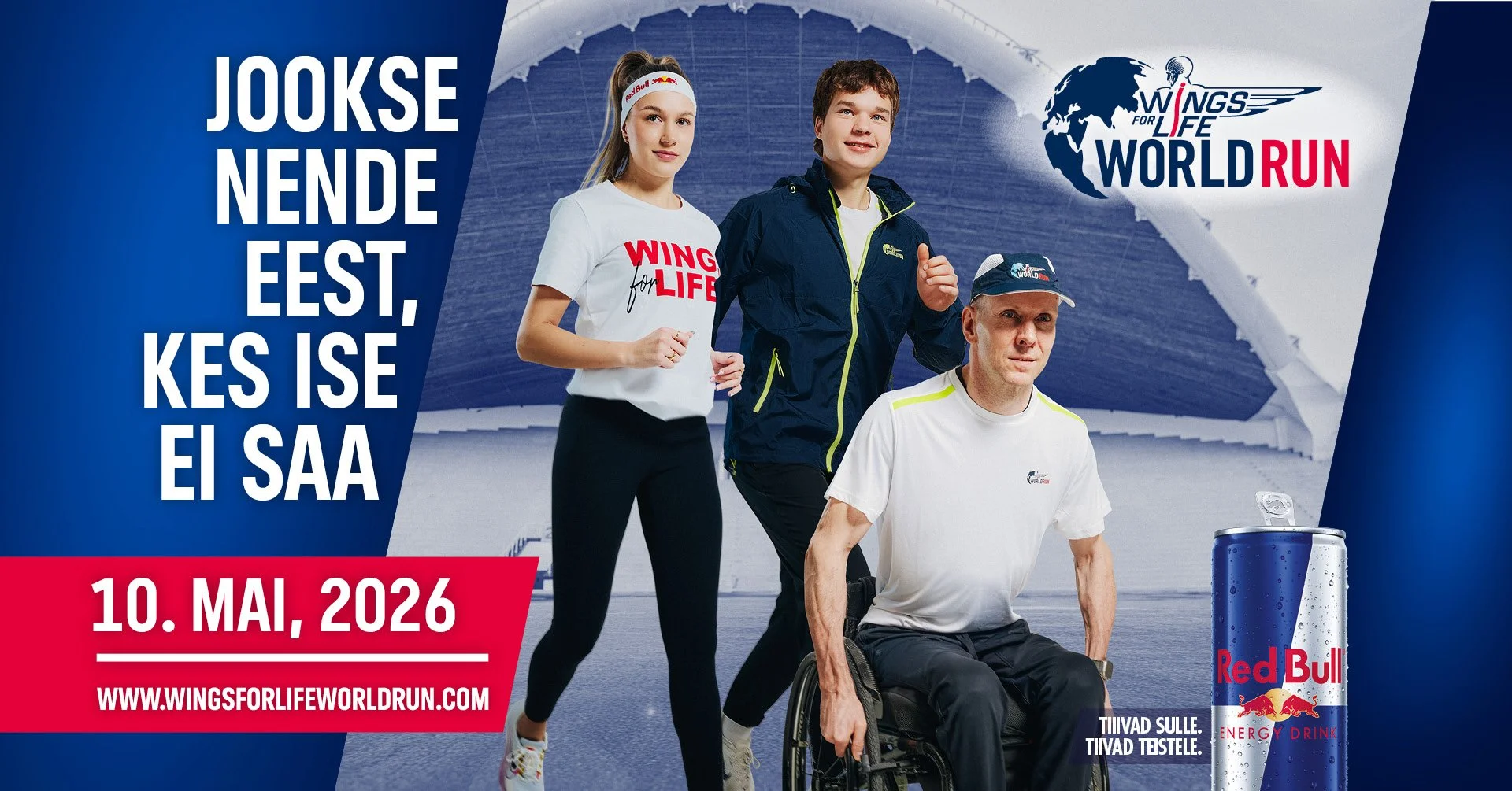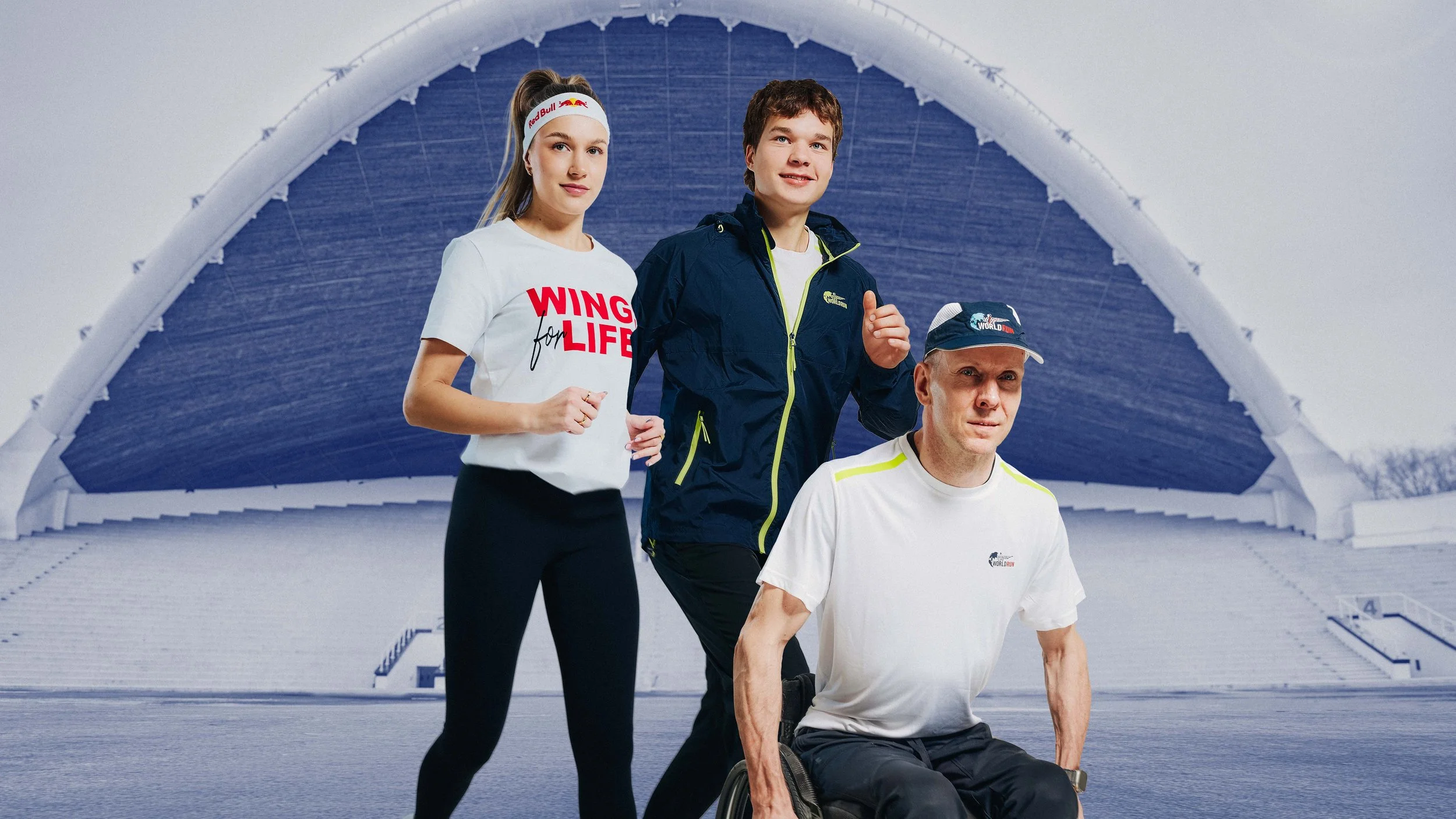 Key visual campaign photography for Red Bull Wings for Life: studio portraits of Estonian athletes and influencers Kelly Sildaru, Thomas Tomp, and Jaano Kraav, composited into dynamic running scene at Tallinna Lauluväljak.